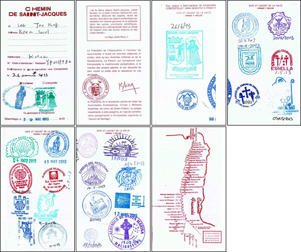 | 생 장 피드포르 순례자사무소에서 발급해 주는 순례자 여권(Credencial,크레덴시알). 순례자 여권이 있어야 순례자들을 위한 숙박시설인 알베르게에 머물 수 있다. 알베르게에 도착하면 각 알베르게별로 고유한 확인도장을 찍어 주는데, 이 확인도장이 있어야 목적지에 도착해서 순례자 증명서를 받을 수 있다. |