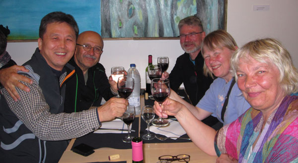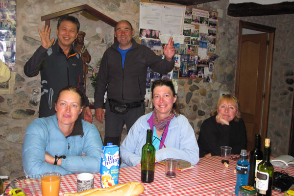 | ‘산티아고 순례길’. 이름만 들으면 한 달 내내 산악지역을 걷는 것으로 생각하기 쉽다. 산악지역도 통과하긴 하지만 실제로는 마을에서 마을, 도시에서 도시로 이동하는 개념이다. 사진은 순례자 식당에서 캐나다 노신사(왼쪽에서 두 번째)와 파리 여성들과 만찬을 즐기는 모습. |