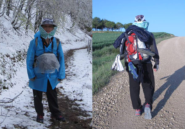 | 순례길 복장 앞모습(왼쪽)과 뒷모습(오른쪽). 배낭과는 별도로 앞으로 메는 작은 가방을 착용했다. 주로 지갑, 휴대폰, 카메라, 우산 등 자주 쓰는 물건을 보관한다. 날씨가 좋은 날에는 배낭 뒤에 수건, 양말 등을 말린다. 알베르게 입장 시 꼭 필요한 슬리퍼와 순례자를 상징하는 조개껍데기는 항상 매달고 다닌다. |