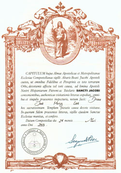 | 한 달간의 고행 끝에 목적지에 도착해서 받은 순례자 증명서. 손에 쥔 것은 종이 한 장이지만 얻은 것은 그 이상이다. 늘 무엇인가 얻기 위해 몸부림쳐 온 나 자신을 되돌아보며, 이제부터는 나누면서 살기로 다짐했다. 정말 큰 소득이다. |