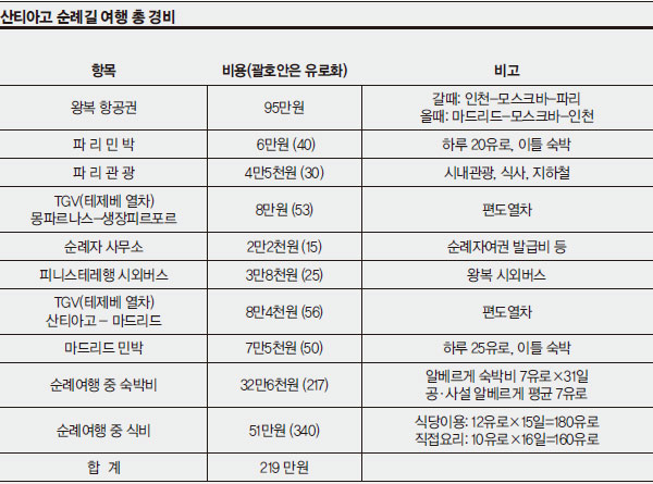 항공편은 경비를 줄이기 위해 최대한 빨리 알아봐야 했다. 주로 포털 ‘다음’의 항공권 검색 페이지(http://air.travel.daum.net)나 인터파크투어(http://tour.interpark.com) 페이지 등에서 알아보았다. 비용을 줄이기 위해 경유 노선을 알아보았다. 갈 때와 올 때 모두 모스크바를 경유하는 항공티켓을 95만원에 구할 수 있었다. 비수기(非需期)였기에 가능한 일이라 여겨진다. 항공권을 살 때는 일정을 정확히 예측하는 것이 중요하다. 나의 경우 예정보다 일찍 순례를 마치게 되어 마드리드에서 새로운 항공편을 구하려 했더니 편도직항 비행기삯이 120만원이나 해 포기했다. 어쩔 수 없이 나흘을 더 마드리드에 눌러앉아 있었다.